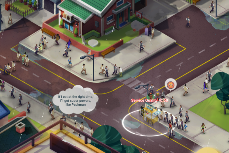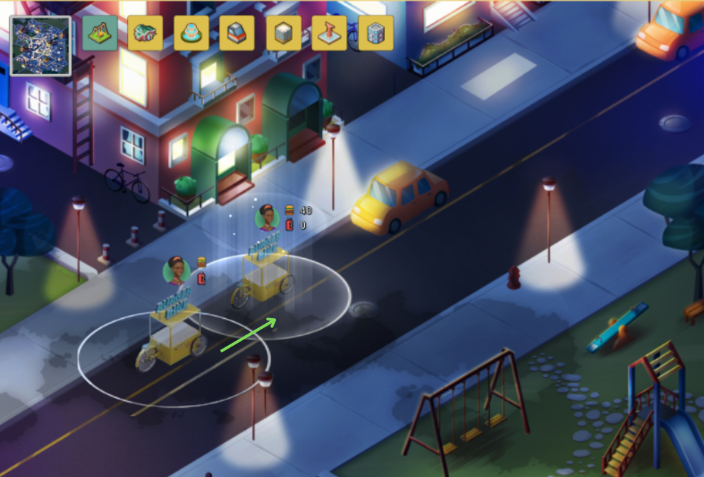 - At the yellow decision point, customers decide whether to buy a burger based on their collision with the stand range.