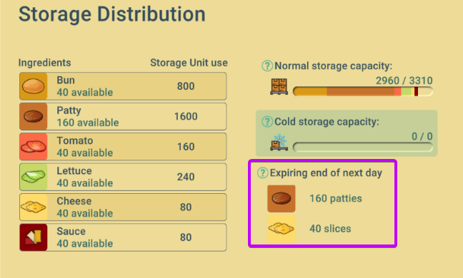 - Expiry: Recall that besides storing drinks, cold storage extends the shelf life of your patties and cheese? Without cold storage, your ingredients will expire after just one day. However, with cold storage, patties and cheese can last up to three days!