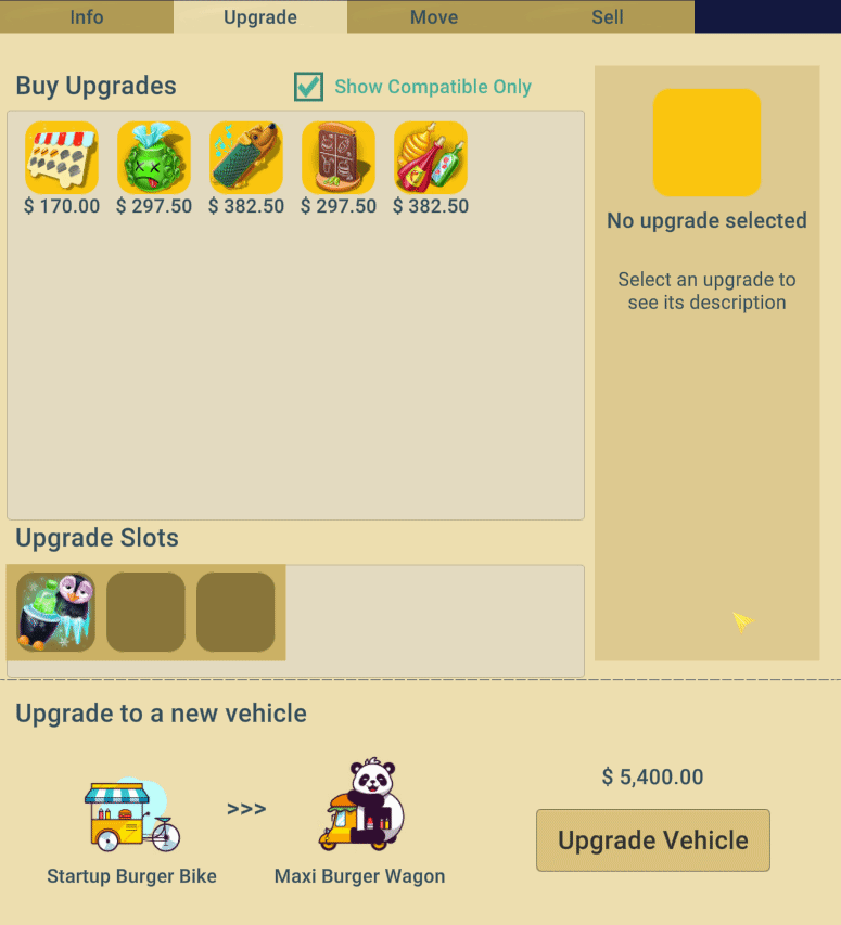 We retained the separation between the Upgrade Vehicle and the Sell Vehicle area from the previous design. That’s because Vehicles can’t be downgraded ⬇️, only sold. 💰