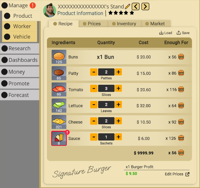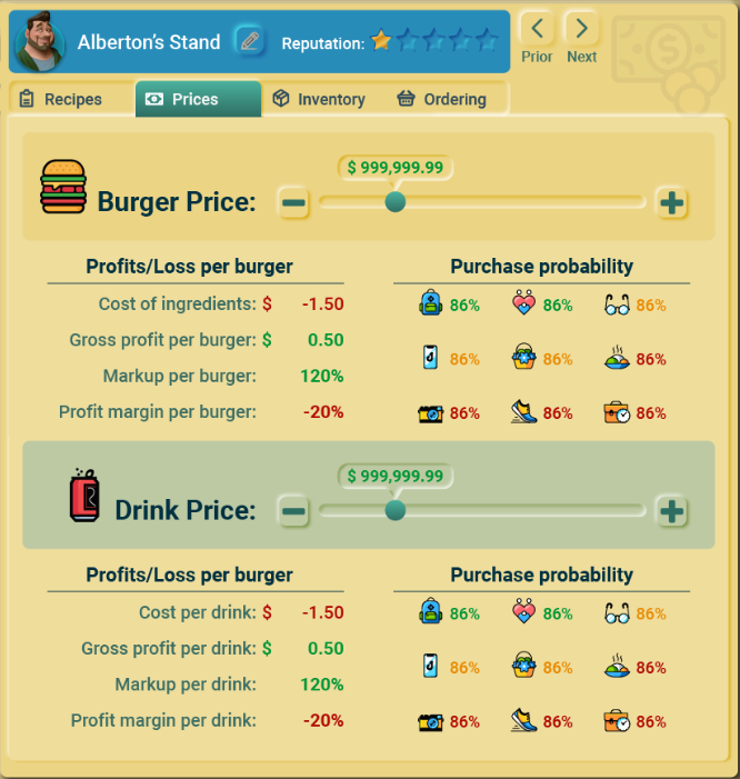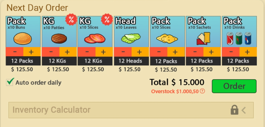 - Researchable Inventory Calculator: As the intricacy of your business grows 💹, you’ll find the inventory calculator indispensable. Newly incorporated as a researchable item 🔬, it automates the purchase orders based on your planned burger production, significantly reducing the time spent on manual calculations ⏱️.