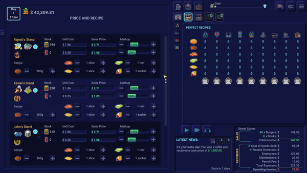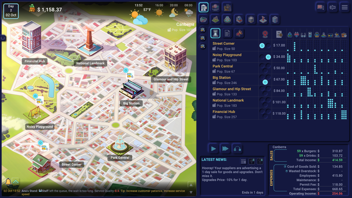 Various in-game elements can assist you in forecasting demand trends. Weather is significant – sunny days draw more customers outdoors, while rainy days mean less customers coming out.