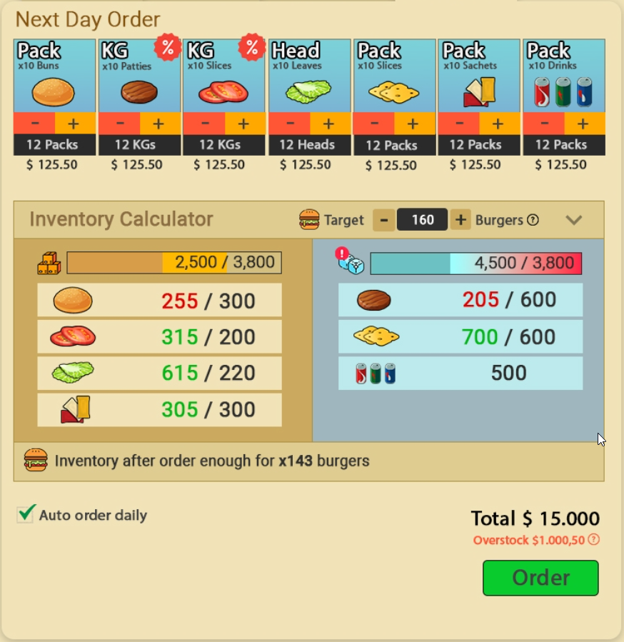 Your recipe determines the minimum inventory you need to stock. A recipe rich in lettuce, for instance, requires a larger lettuce stockpile than usual. 🥗