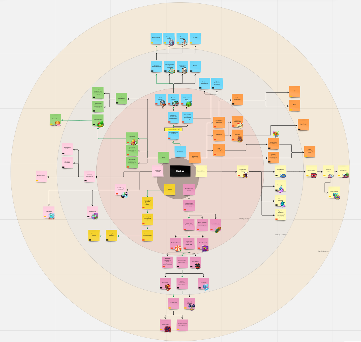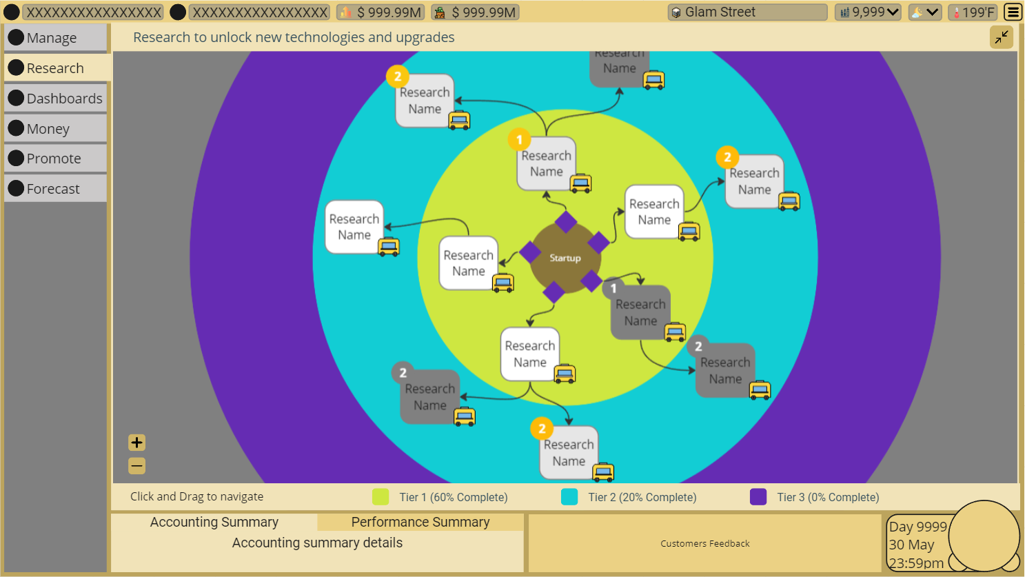 The current design is a comprehensive research tree with 3 tiers and 7 tantalizing research paths that cover various operations and business management functions: