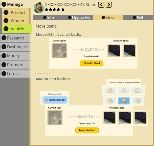 To improve the experience, we introduced the vehicle management section into the new design. The upgrade ⬆️, movement, and sell stand functions are now grouped into one section.