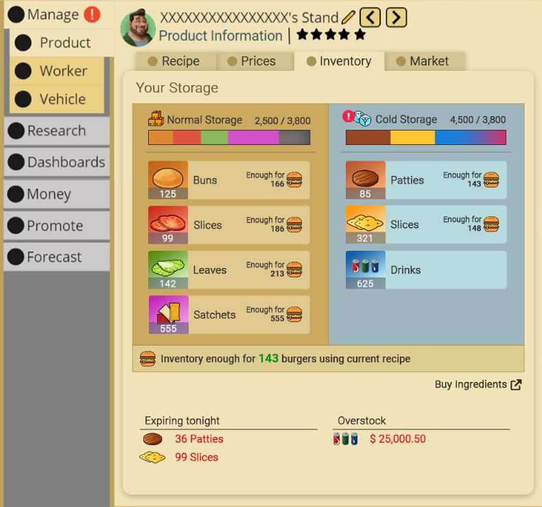 - We had separate screens for normal and cold storage 🌡️, split between burger and drink inventory. 🍔🥤